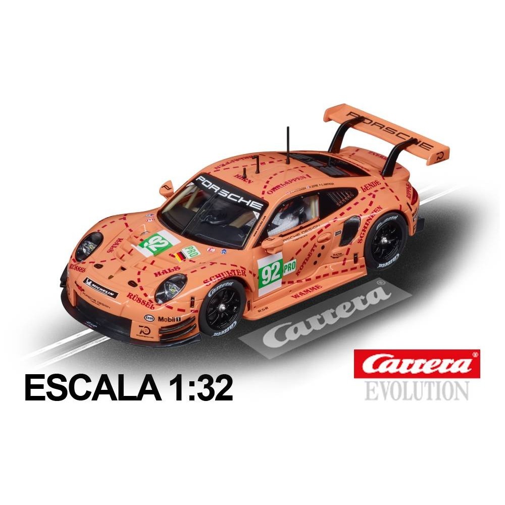 El Coche Carrera Evolution Porsche 911 RSR Pink Pig Design n92 reproduce a escala 1:32 y sistema analógico el espectacular coche de las 24H de Le Mans que conmemora los 70 años de POrsche en la competición.