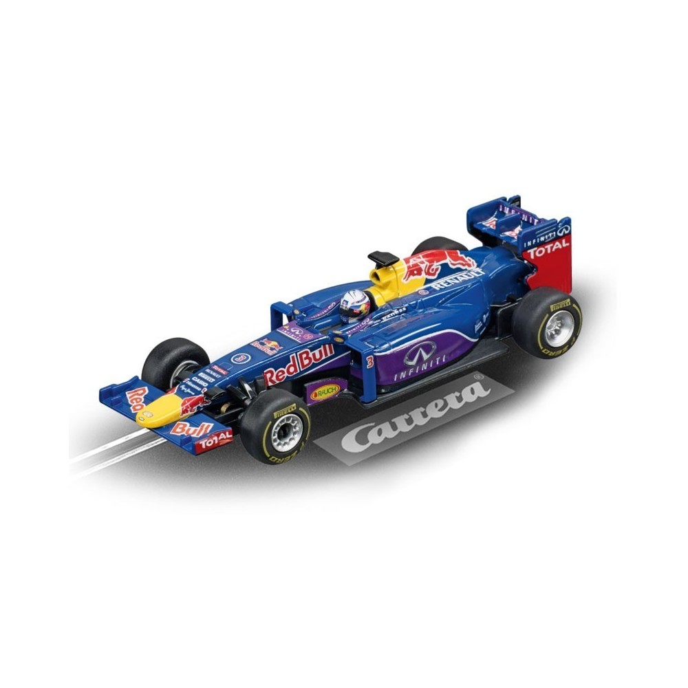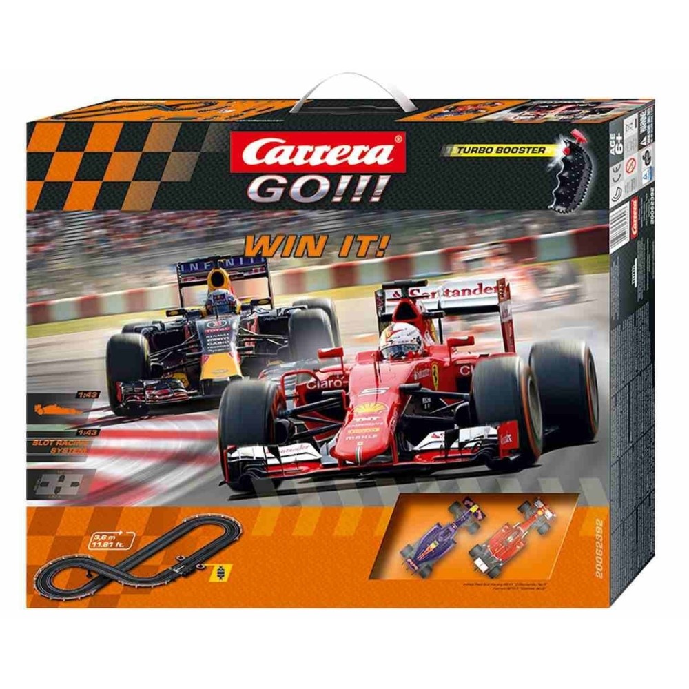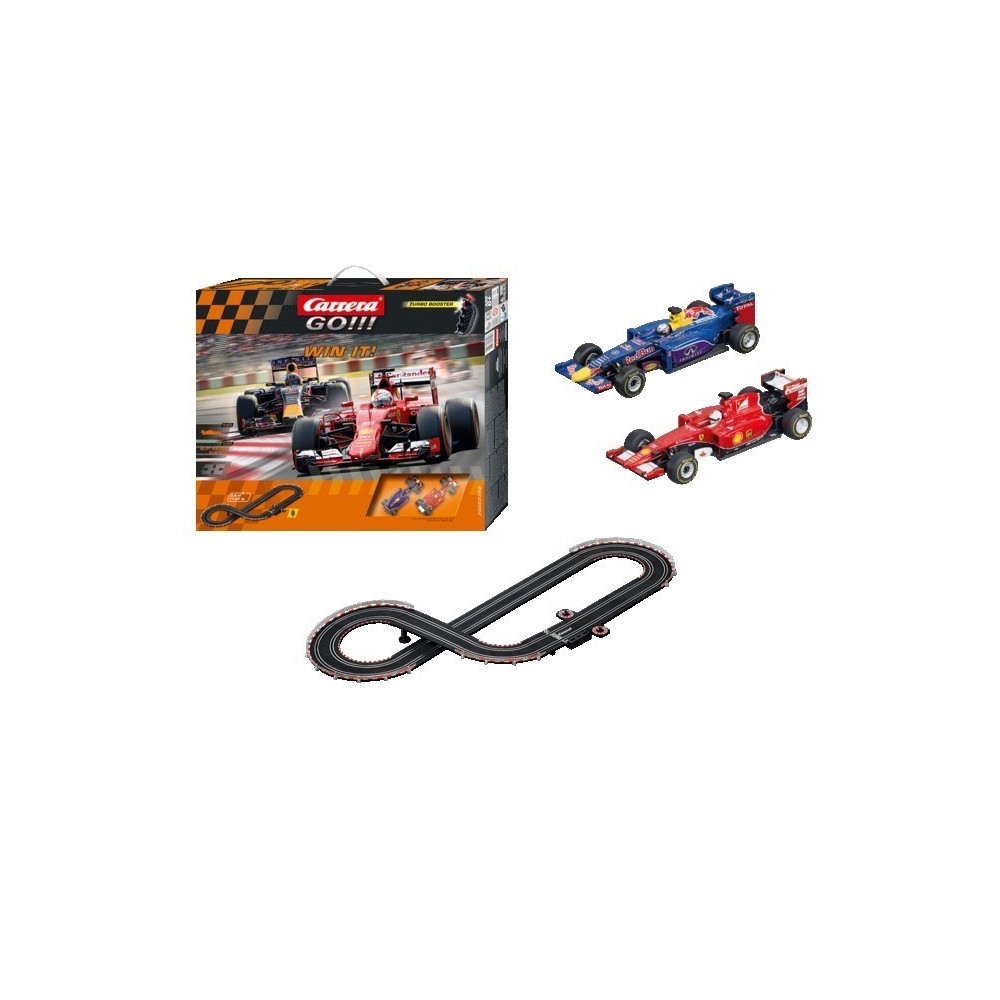 Con el Circuito Carrera Go Win It tienes un circuito de F1 básico pero con todo lo necesario para hacer tus primeras carreras. Incluye dos coches del mundial de F1, el Ferrari SF15-T S.Vettel No.5 y el Infiniti Red Bull de Ricciardo