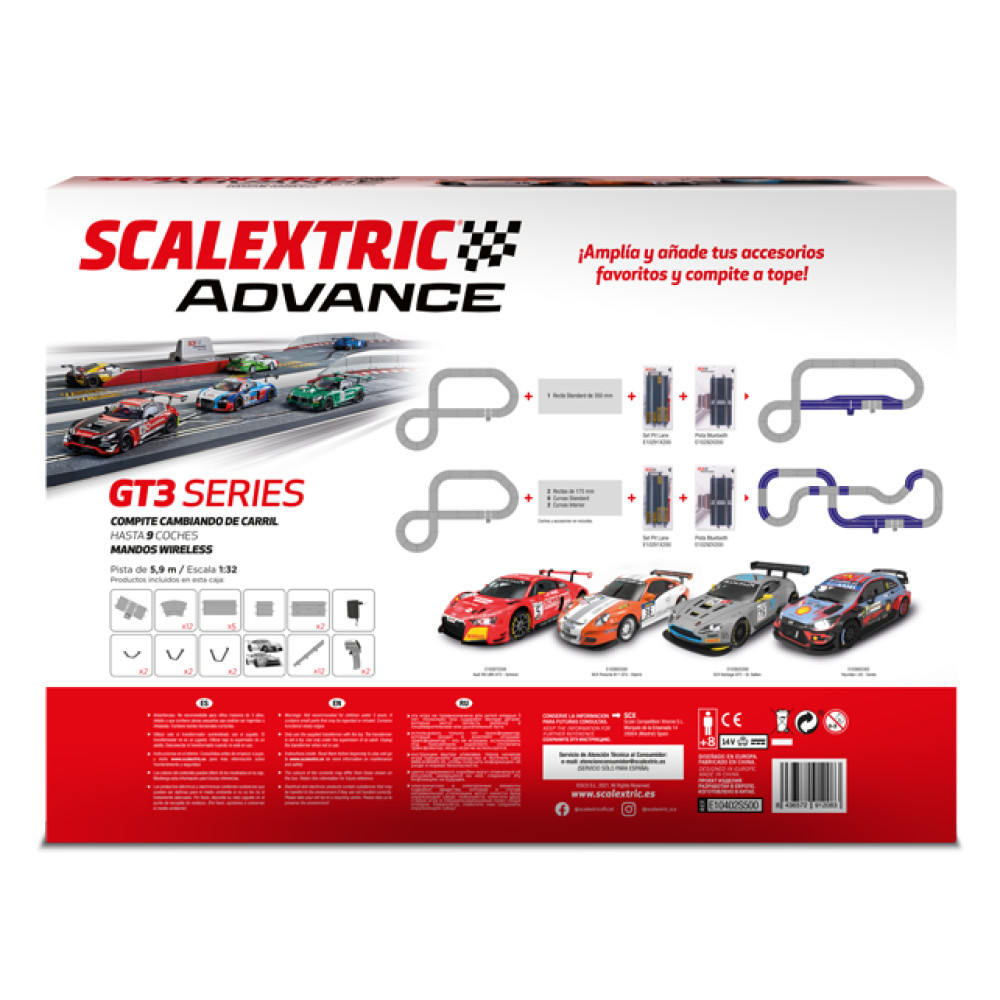 Scalextric Advance pone en tus manos en la escala reina 1:32 toda la potencia de los sistemas digitales conocidos, pero da un salto tecnológico a nivel prestaciones en la sensibilidad y el control del coche en carrera. La conexión a Smartphone y Tablet te permite el setup de los coches y carreras con las pistas Bluetooth (E1029X200). Dos coches GT incluidos, el Porsche 911 GT3 - Hybrid y el Vantage GT3 - St. Gallen. Monta el circuito y disfruta desde el primer día. Encuentra un montón de accesorios y pistas para ampliar tu circuito Scalextric Advance.