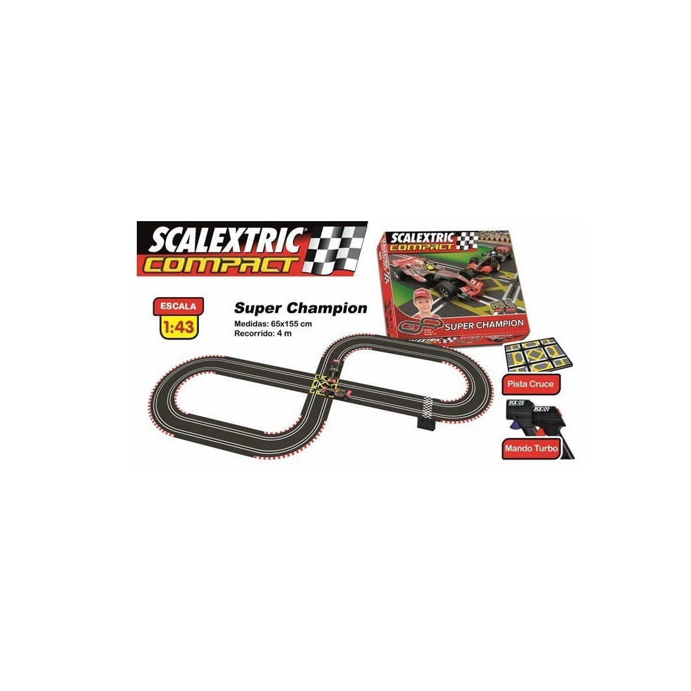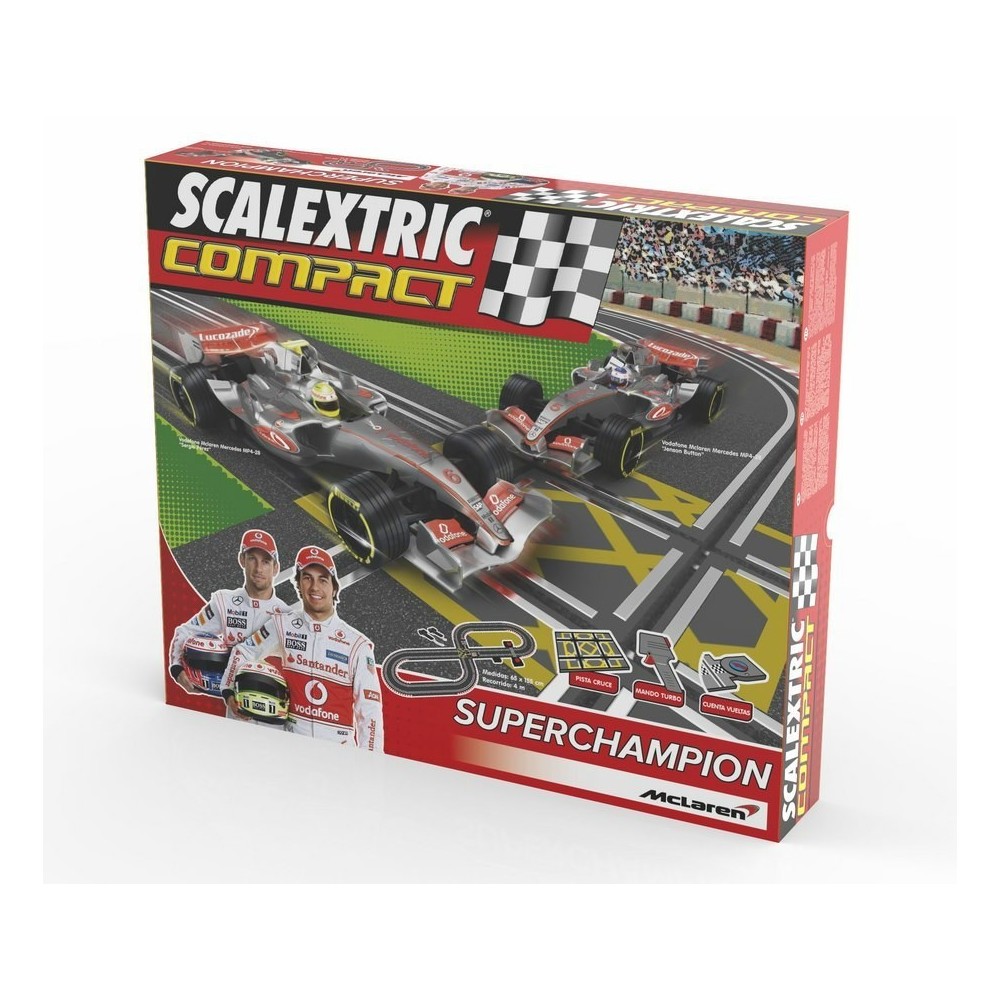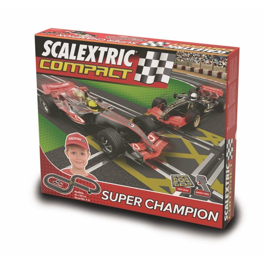 Circuito de Scalextric Compact Super Champion CC3D. Su escala 1:43 es ideal para iniciarse en las carreras de Scalextric incluso en la habitación más pequeña de la casa .