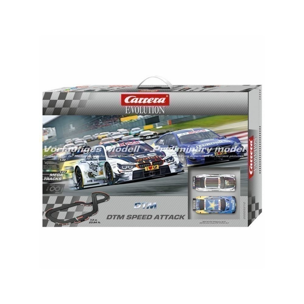 El Circuito Carrera Evolution DTM Speed Attack es un circuito tipo DTM de gran recorrido y a escala 1:32 donde compiten los favoritos del campeonato alemán, Wittman con un BMW M4 DTM y Pafett con un Mercedes C-Coupe DTM. Todo el espectáculo de esta competición en tu pista Evolution.