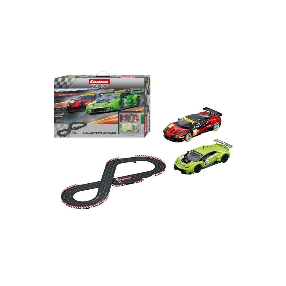El Circuito Carrera Evolution Unlimited Racing es un circuito GT en forma de 8 a escala 1:32 y que incluye dos espectaculares coches, como son el Lamborghini Huracán GT3 y Ferrari 458 Italia GT2.