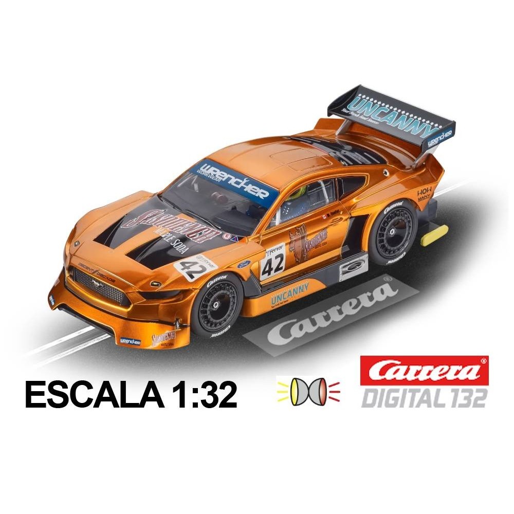 o Carro Carrera Digital 132 Ford Mustang GTY n42 reproduz em escala 1:32 para o sistema Digital Carrera 132 o potente esportivo americano em laranja metálico.