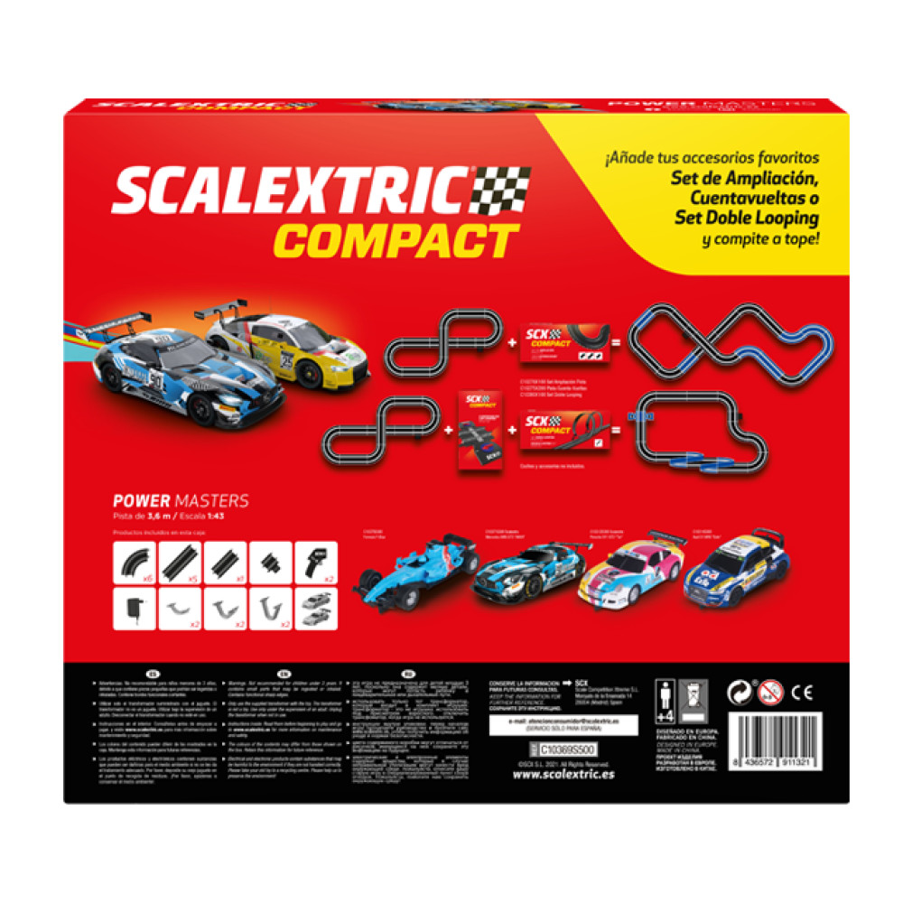 Circuito Scalextric Compact en forma de 8, escala 1:43. Cuatro variantes de trazado para más diversión. Mandos Wireless específicos para la mano del niño y con turbo para experimentar una aceleración espectacular. Dos coches con luces incluidos y disfruta del gran puente. ¡Adelanta a tu compañero y sé el primero en pasar por la meta!