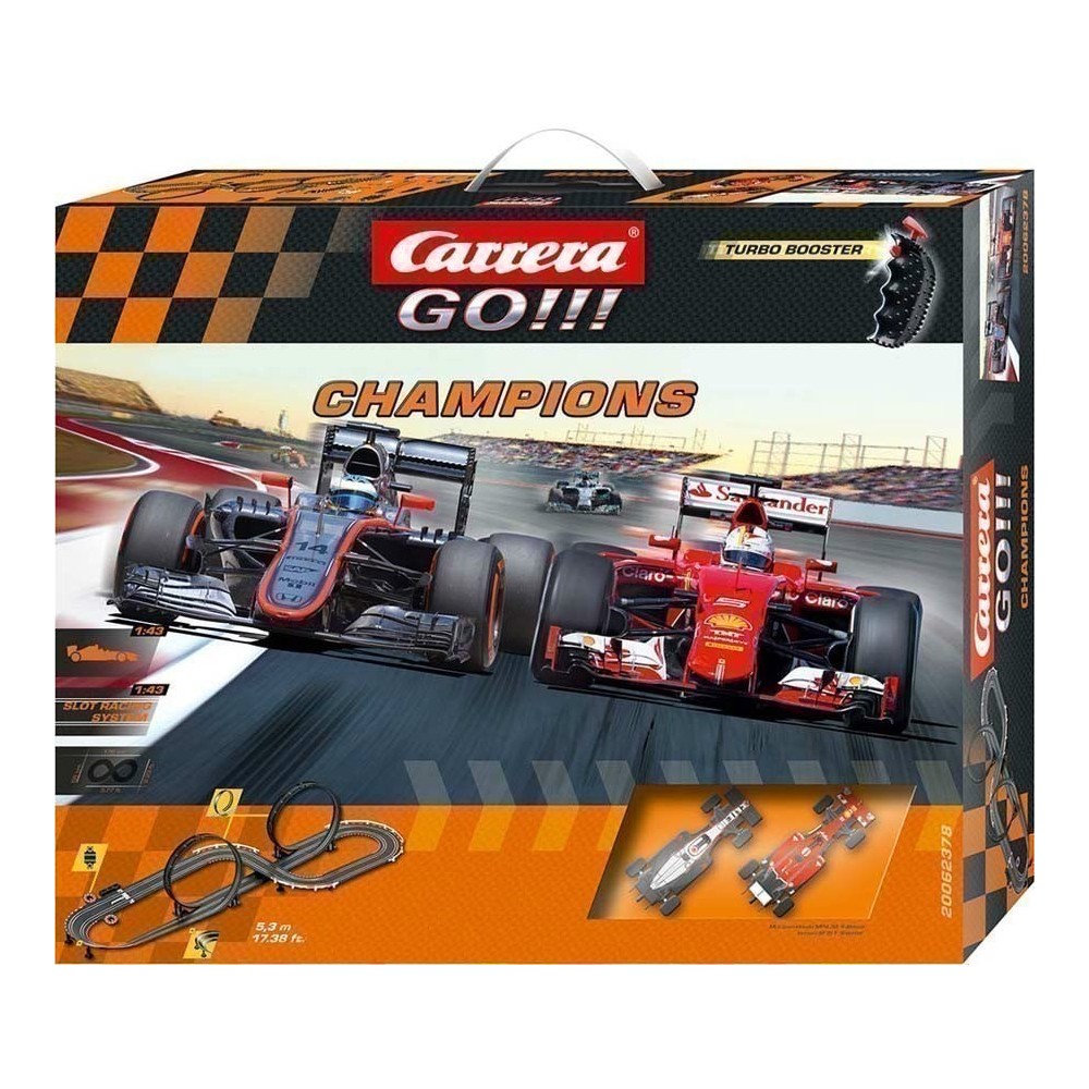 No Campeões do circuito Carrera Go você terá o duelo de F1 entre Fernando Alonso com a Mclaren e Sebastian Vettel com a Ferrari.