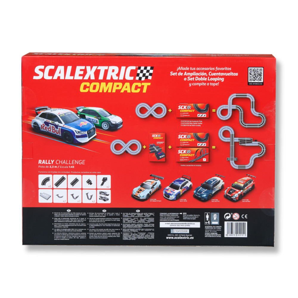 Pon a prueba tu experiencia de piloto y compite con dos coches de rally. Recuerda que la línea Compact es compatible entre sí y te permite ampliar pistas, accesorios y competir con distintos modelos de coche.