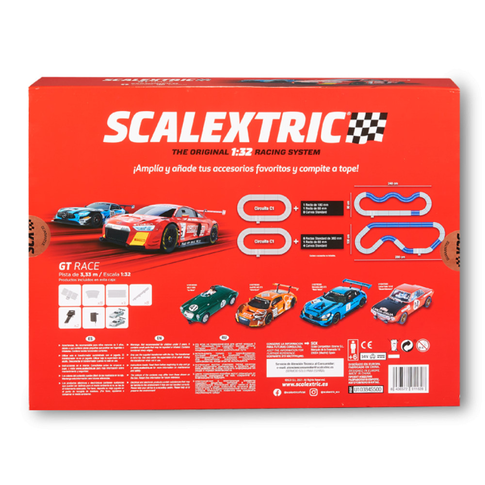 Circuito GT Race. Disfruta de la experiencia clásica de Scalextric con la última tecnología. Un circuito de carreras de 3,3 metros de pista con curvas y mandos estándar originales. Dos coches Slot incluidos: La experiencia con dos coches de carreras slot GT: Audi R8 LMS GT3 y un Mercedes AMG GT3. Monta el circuito y disfruta desde el primer día.