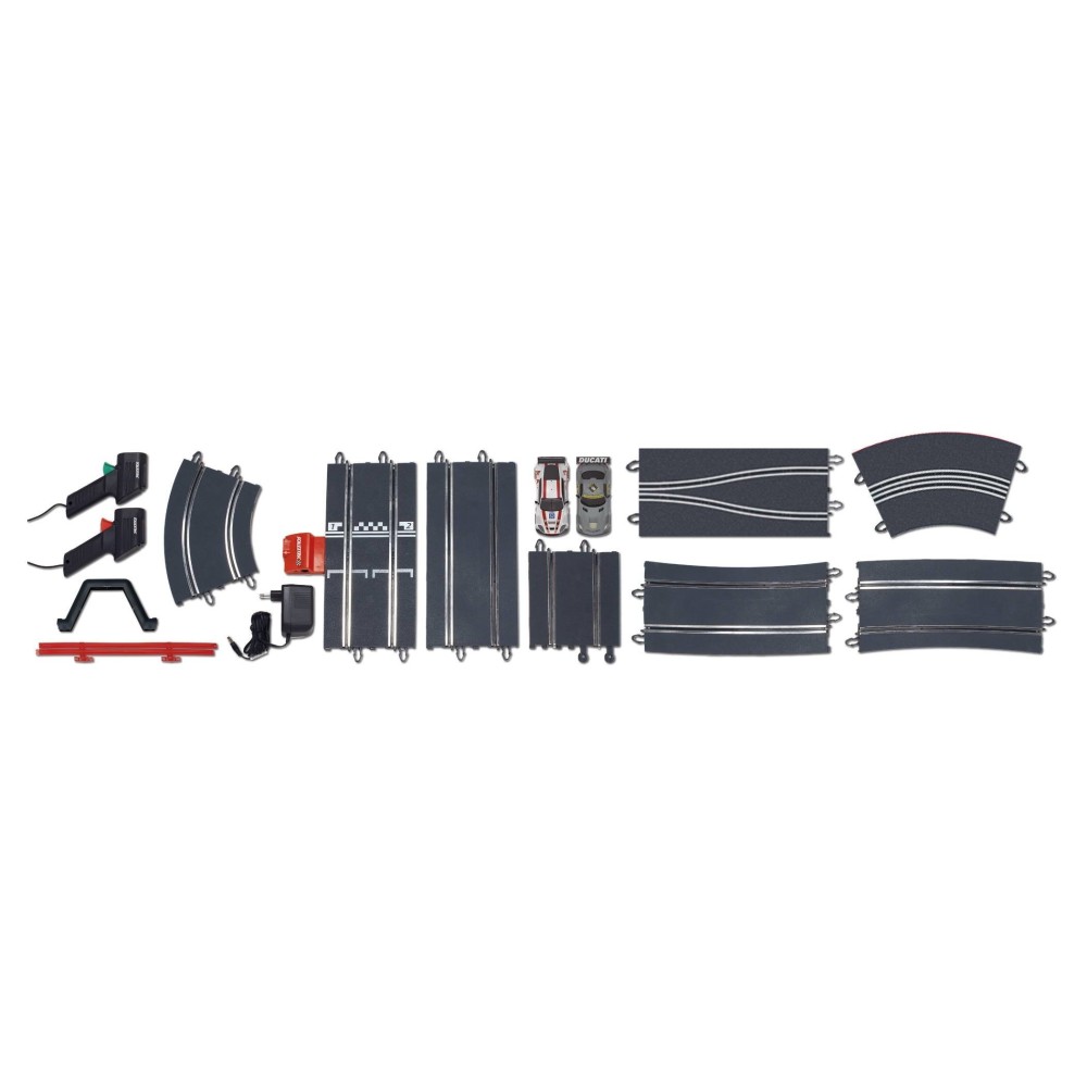 • 2 carros Scalextric (1 Aston Martin DBR9 e 1 Mercedes SLS GT3)