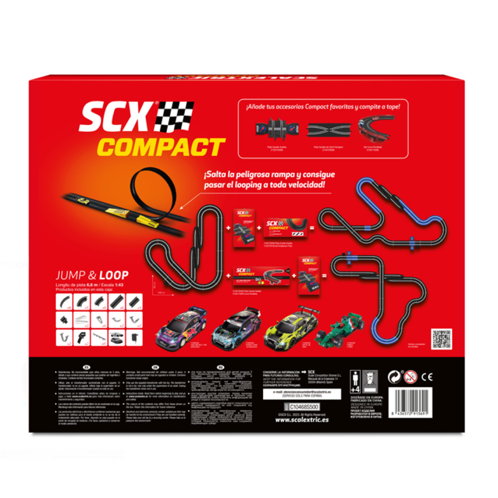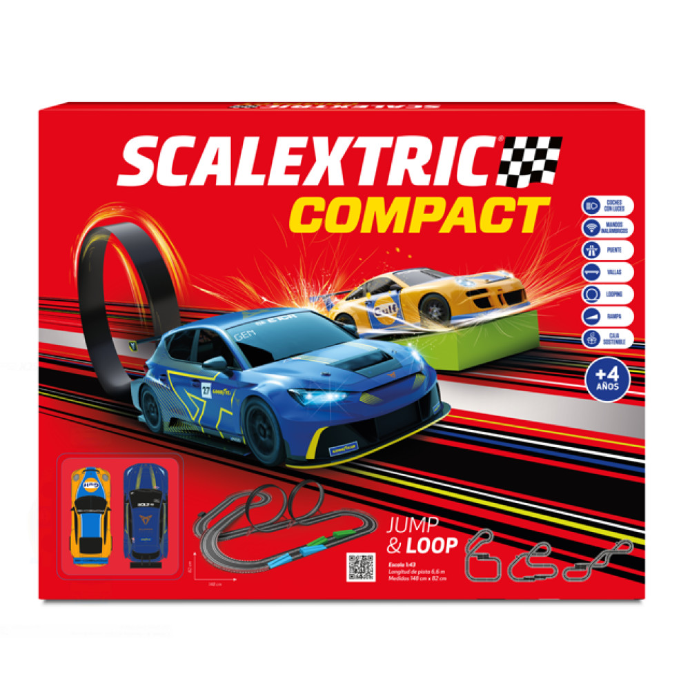 Scalextric Compact con 6,6 metros de pista, escala 1:43. Mandos Wireless específicos para la mano del niño y con turbo para una experimentar una aceleración espectacular. Dos coches incluidos. Espectacular looping de doble rizo, puente, vallas y dos espectaculares rampas para dar los saltos increíbles. ¡Adelanta a tu compañero y sé el primero en pasar por la meta! Pon a prueba tu experiencia de piloto y compite a tope!.