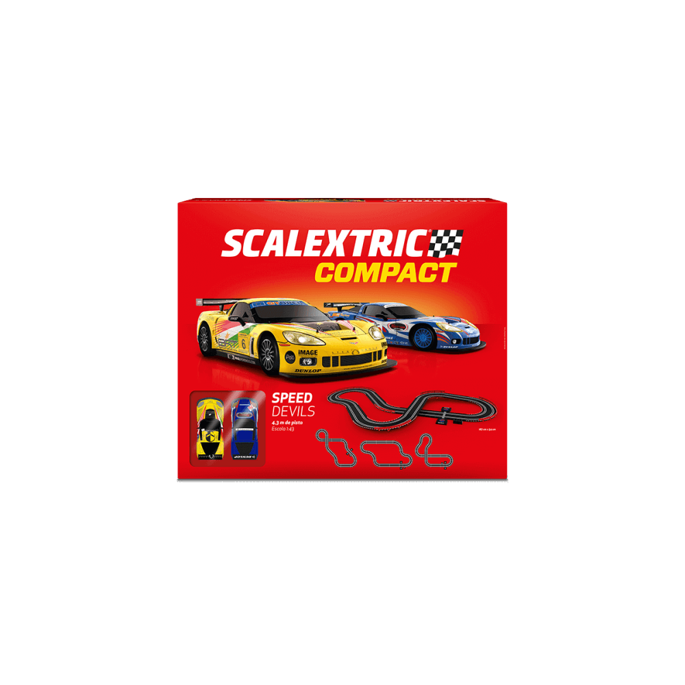 O circuito de Speed Devils Scalextric Compact É um circuito médio na gama Compact que inclui um flyover e 5 zonas de canto. As faixas incluídas têm diferentes possibilidades, então você pode andar até 4 versões diferentes de circuito.