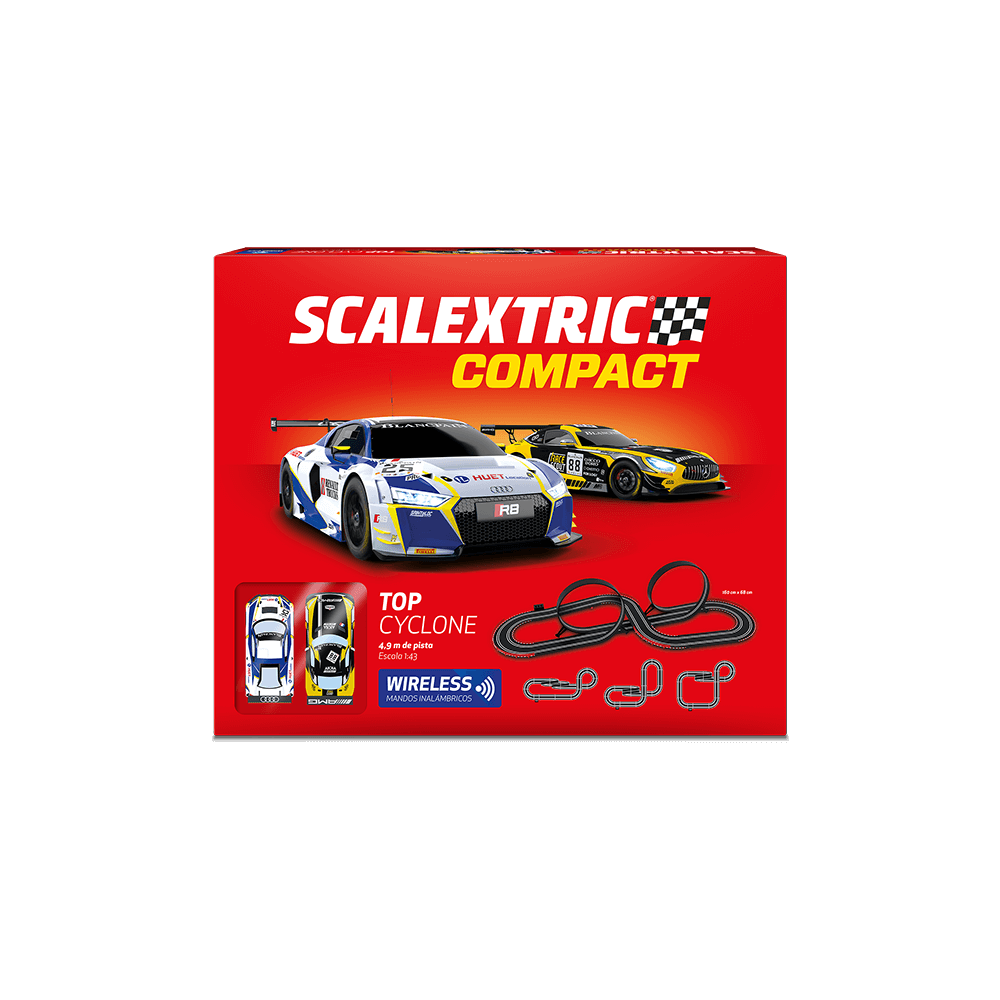 Scalextric Compact permite que você tenha um circuito Scalextric em um espaço muito pequeno. São projetados e fabricados em escala 1:43, portanto são menores que os normais e podem ser montados em qualquer cômodo da casa.