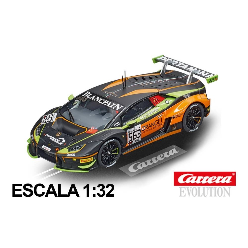 O Carrera Evolution Lamborghini Huracan Orange1 FFF Racing Car reproduz em escala 1:32 No sistema analógico o espetacular esportivo italiano com decoração em preto e laranja. Um modelo especial que não pode faltar na sua grelha inicial.