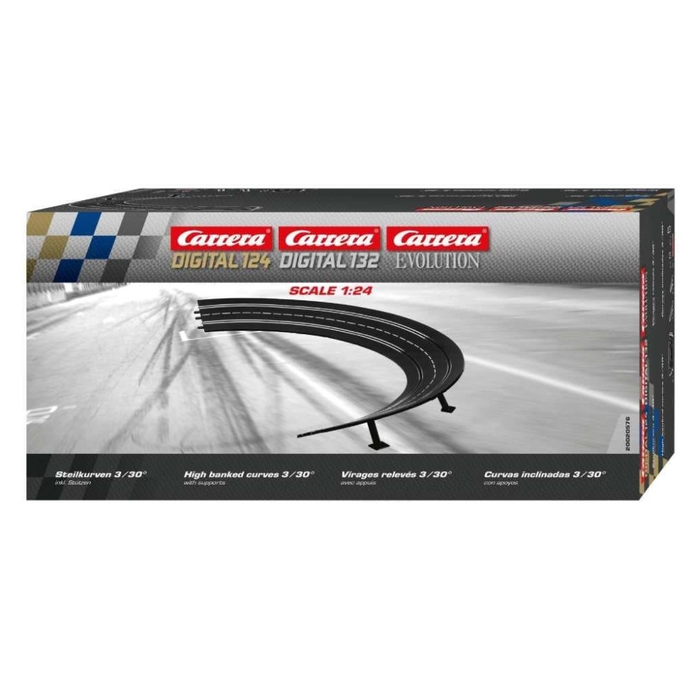 Com a Curva proibida 3/30 ° (6 unidades) Carrera 132-124 você pode adicionar a mais ampla seção de alta velocidade ao seu circuito de slot Carrera. É composto por curvas inclinadas de 30º com raio 3.