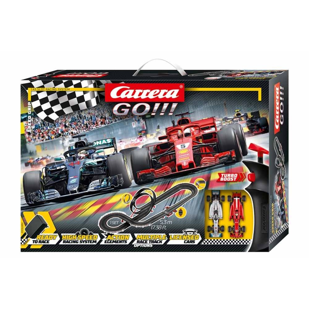 Com ele Circuito Carrera Go Speed Grip você experimentará as corridas de F1 com o duelo espetacular entre a Mercedes de Hamiton e a Ferrari de Vettel.